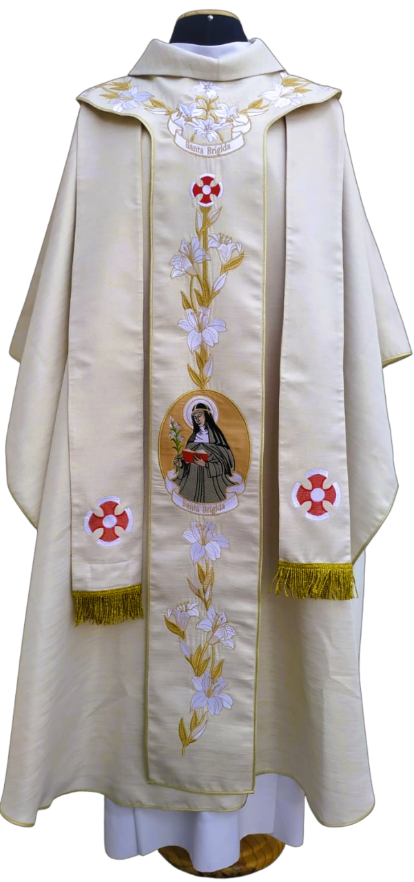 Acompanha estola bordada (confeccionada com o mesmo tecido) de casula.
